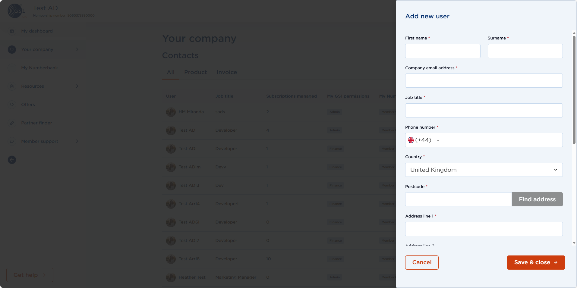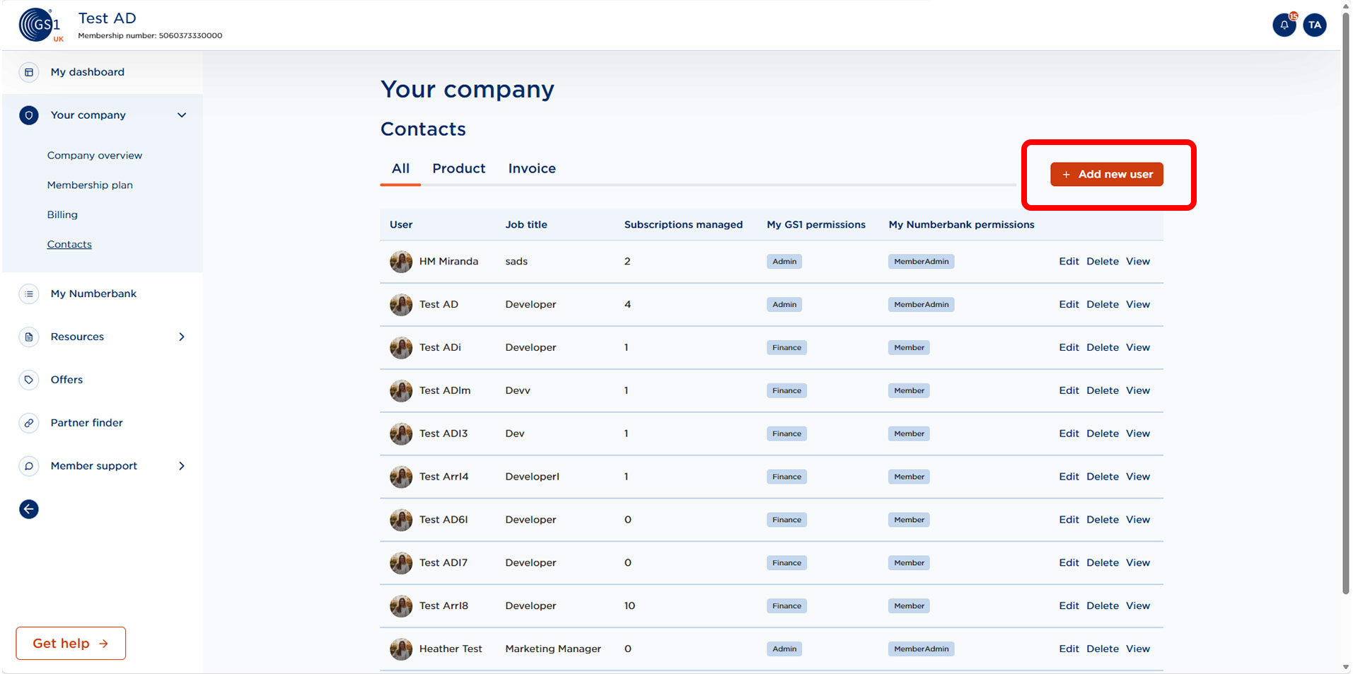 User details can be viewed and edited by selecting Contacts within Your Company on MyGS1. New users can be added by selecting Add new user.